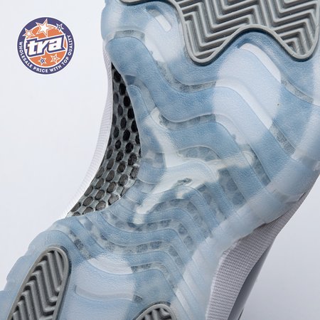 The 2010 reissue of the Air Jordan 11 Retro "Cool Grey" revives a fan-favorite colorway initially released in 2001. Like the original, a monochromatic neutral grey finish suffuses the upper, constructed from nubuck with a glossy patent leather overlay. A full-length Air unit enhances the cushioning properties of a lightweight Phylon midsole. Underfoot, a carbon fiber shank plate is visible through the translucent rubber outsole, equipped with herringbone traction pods under the forefoot and heel.